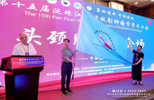 首先,本次大会主席,泛珠江区域放射肿瘤学协作组副主席、四川省肿瘤医院党委书记郎锦义教授主持了大会会旗交接仪式,郎教授首先感谢为本次大会的顺利召开给予大力支持的各位同道及同事,随后西部放射治疗协会秘书长钟海洛教授与澳门镜湖医院萧光莉教授交接了泛珠江区域放射肿瘤学学术大会会旗,下一届学术会议将于明年4月在广东珠海举办。